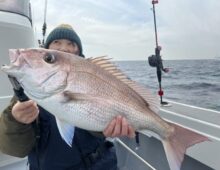 こんにちわ 副船長の野原です 今日は予報よりも風が吹き、少しやりにくい状況てましたが、皆さん頑張って頂きました。 初真鯛で57センチ👏・・・