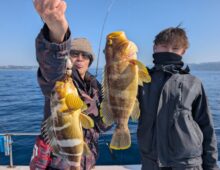 海心丸船長の湟打です。 ライトジギング&タイラバ 連休3日目は、2ノットの激潮入り、開始早々全員安打! 次々に竿曲がって、オウモンハタ、ホウキハタ、アコウ・・・